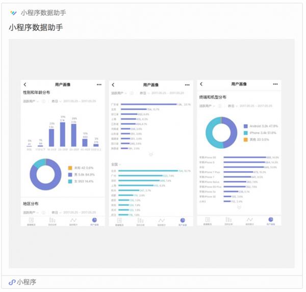 1、新增 “用户画像” 数据。支持查看小程序新增或活跃用户的性别、年龄、地区、设备分布。开发者可以登录小程序后台,进入数据分析 -> 用户画像,或点击下方小程序数据助手查看相关数据(数据每天早上更新)。